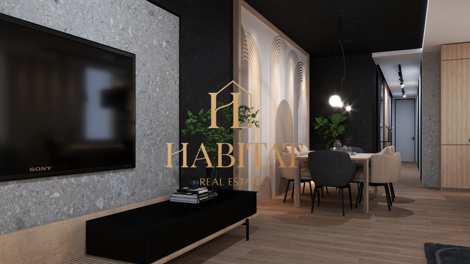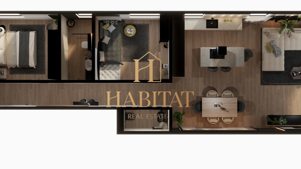 Stan se sastoji od dnevnog boravka, kuhinje i blagovaone, 3 spavaće sobe, dvije kupaone i wc-a te natkrivene terase.