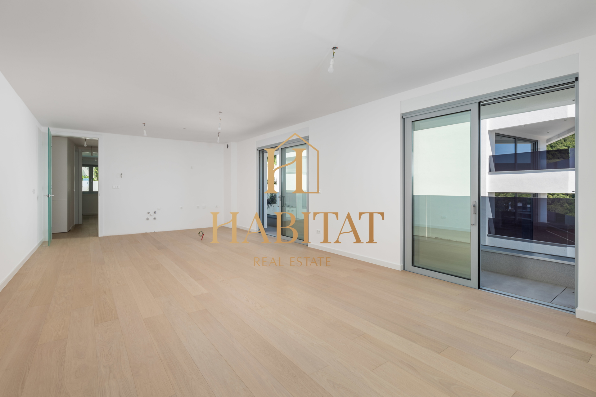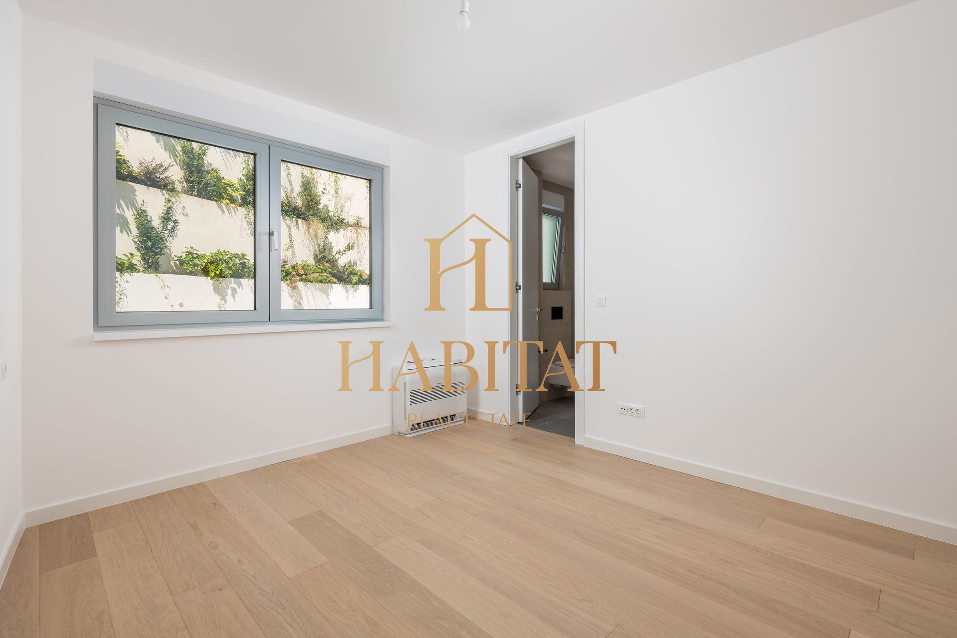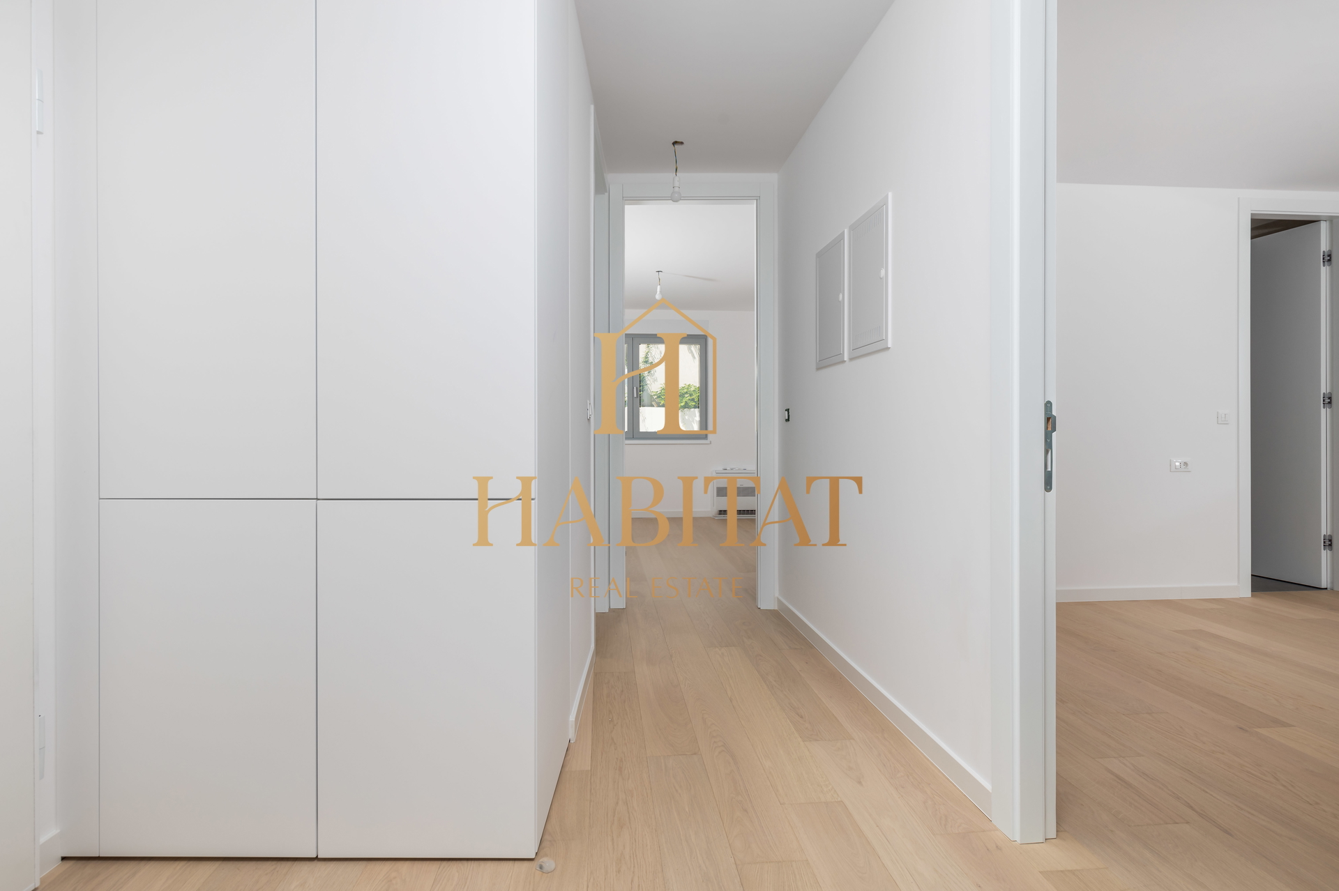 Prostrani prizemni stan s dvije spavaće sobe, dvije kupaone i WC-om. Unutarnjih 82,34 m2 povezano je s terasom od 29,78 m2. Stan dolazi s dva garažna parkirna mjesta.