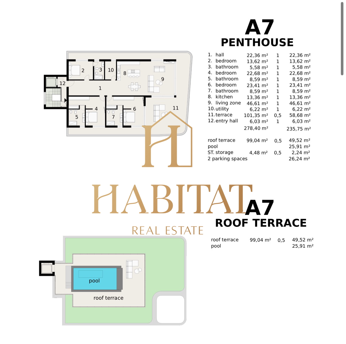 Penthouse oznake A7 raspolaže s tri spavaće sobe i tri kupaonice.