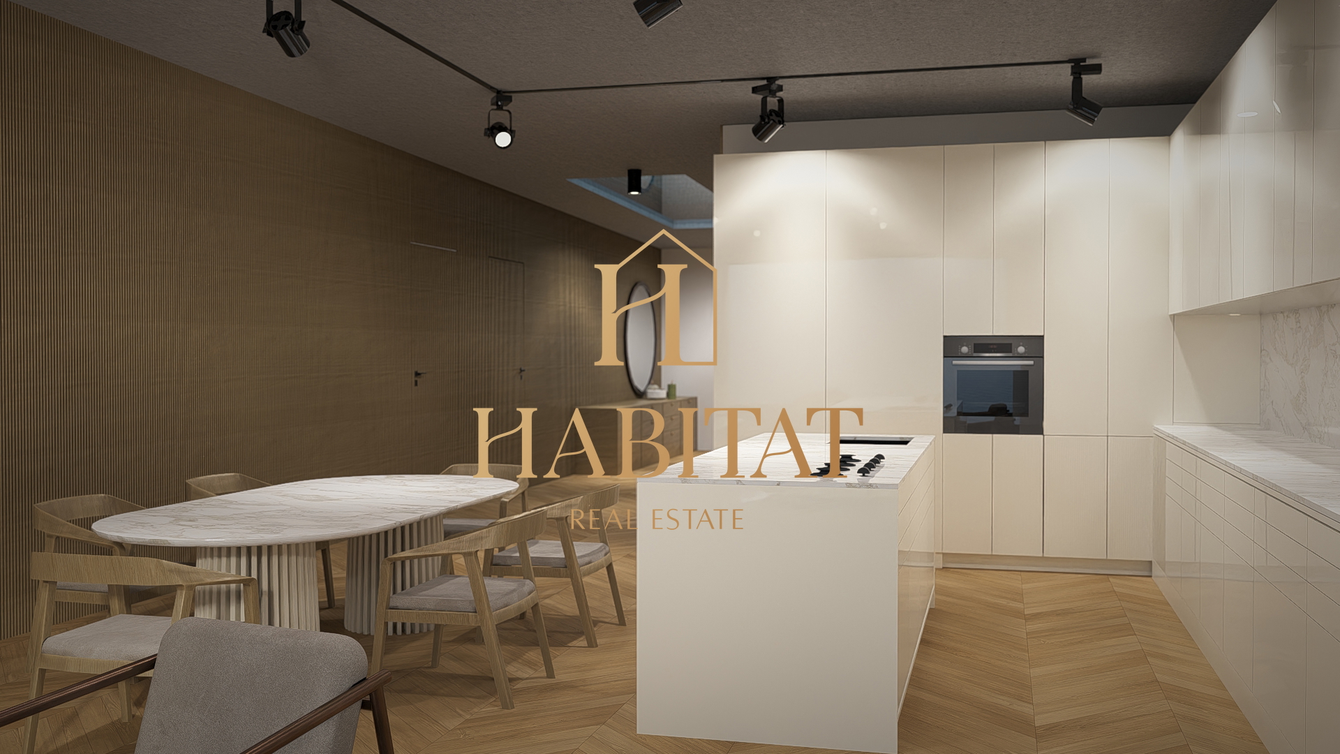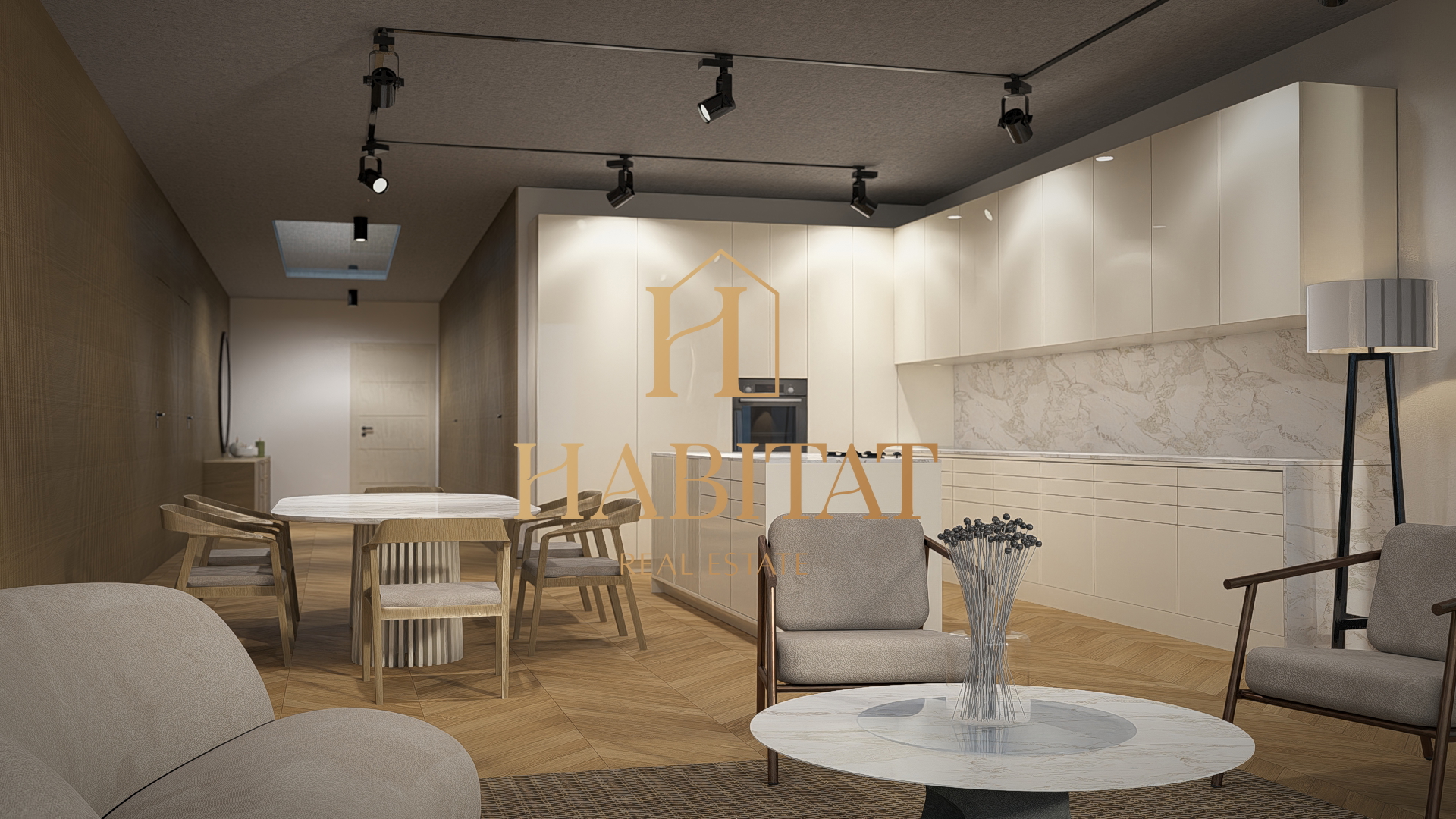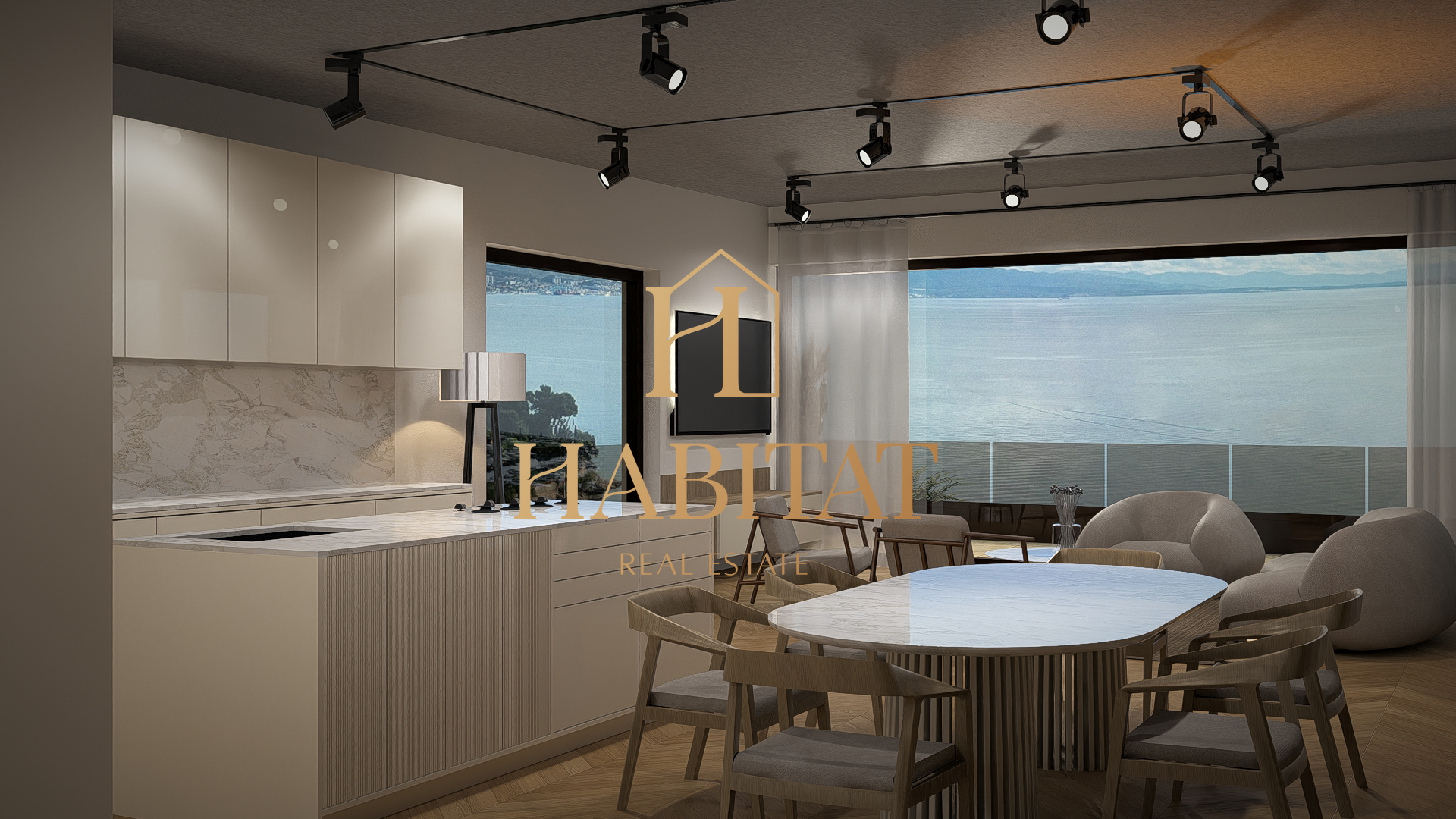 Središnji dio stana čini impresivan dnevni boravak s kuhinjom i blagovaonicom u otvorenom konceptu, koji se prirodno nastavlja na prostranu terasu. Velike staklene stijene omogućuju obilje prirodnog svjetla i neometan pogled na more, stvarajući savršen ambijent za opuštanje i druženja tijekom cijele godine.